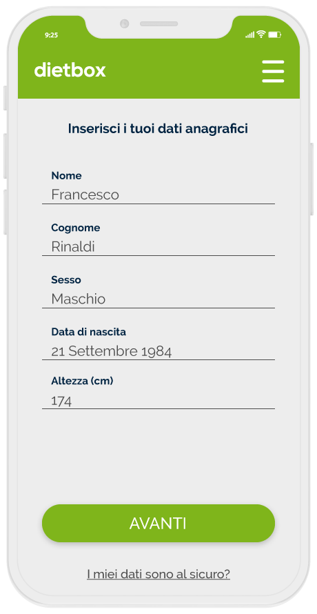 Una volta istallata l’app avrai accesso al modulo di registrazione. Ti verrà chiesto il tuo nome, cognome, sesso, data di nascita e altezza.
